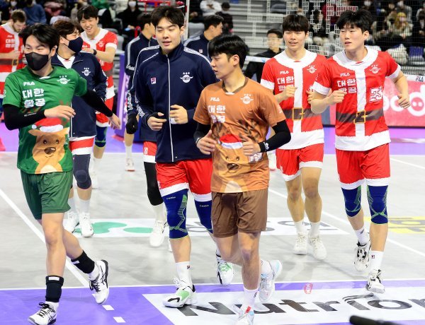 25일 인천 계양체육관에서 ‘2022-2023 도드람 V리그’ 인천 대한항공과 서울 우리카드의 남자부 경기가 열렸다. 대한항공 선수들이 산타 유니폼을 착용하고 훈련을 하고 있다.