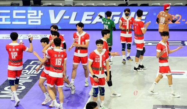 25일 인천 계양체육관에서 ‘2022-2023 도드람 V리그’ 인천 대한항공과 서울 우리카드의 남자부 경기가 열렸다. 대한항공 선수들이 산타 유니폼을 착용한 후 팬들에게 선물을 전달하고 있다.