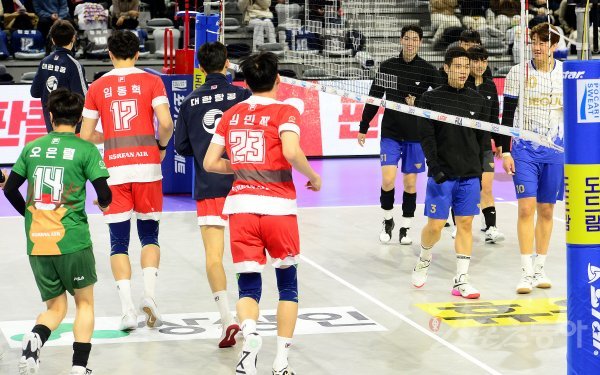 25일 인천 계양체육관에서 ‘2022-2023 도드람 V리그’ 인천 대한항공과 서울 우리카드의 남자부 경기가 열렸다. 우리카드 선수들이 대한항공 선수들의 산타 유니폼을 바라보고 있다.