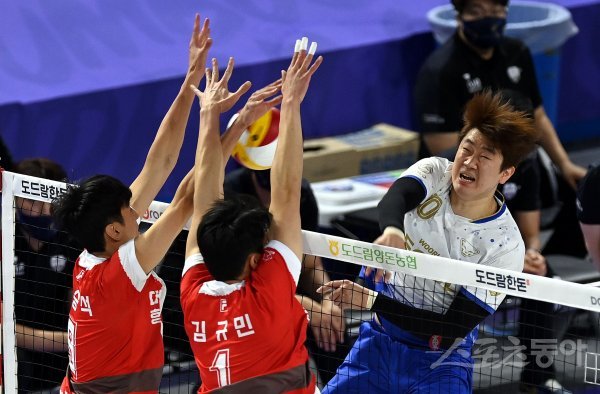 25일 인천 계양체육관에서 ‘2022-2023 도드람 V리그’ 인천 대한항공과 서울 우리카드의 남자부 경기가 열렸다. 우리카드 나경복이 대한항공 블로커를 피해 스파이크를 날리고 있다.