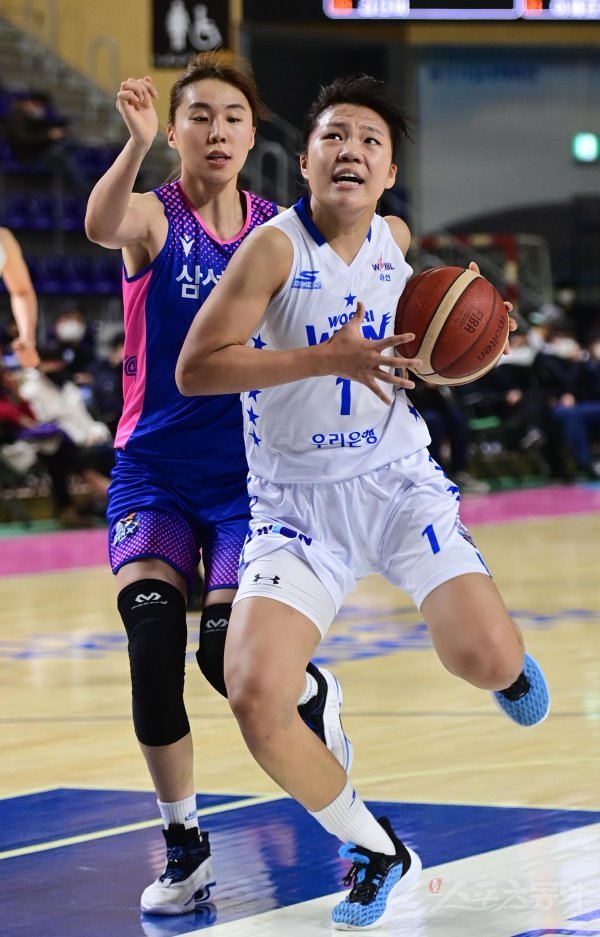 26일 경기도 용인실내체육관에서 열린 ‘신한은행 SOL 2022~2023 여자프로농구‘ 용인 삼성생명과 아산 우리은행의 경기에서 우리은행 박지현이 삼성생명 강유림의 수비를 뚫고 골밑 돌파하고 있다.