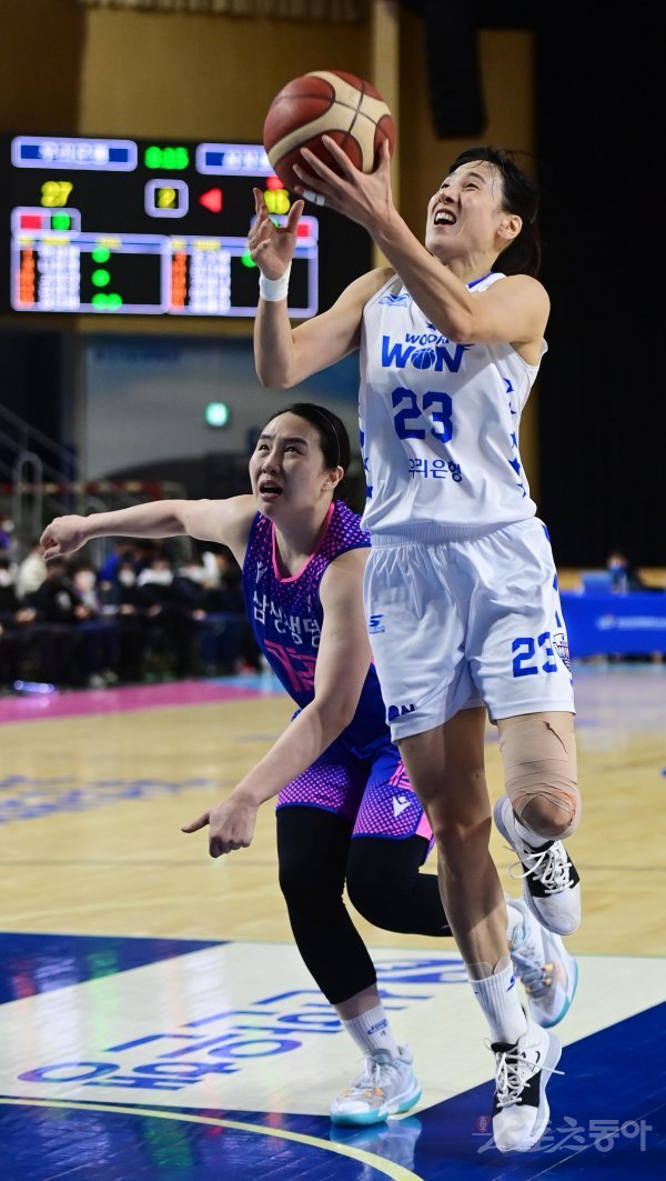 26일 경기도 용인실내체육관에서 열린 ‘신한은행 SOL 2022~2023 여자프로농구‘ 용인 삼성생명과 아산 우리은행의 경기에서 우리은행 김단비가 삼성생명 김단비를 수비를 뚫고 슛을 하고 있다.