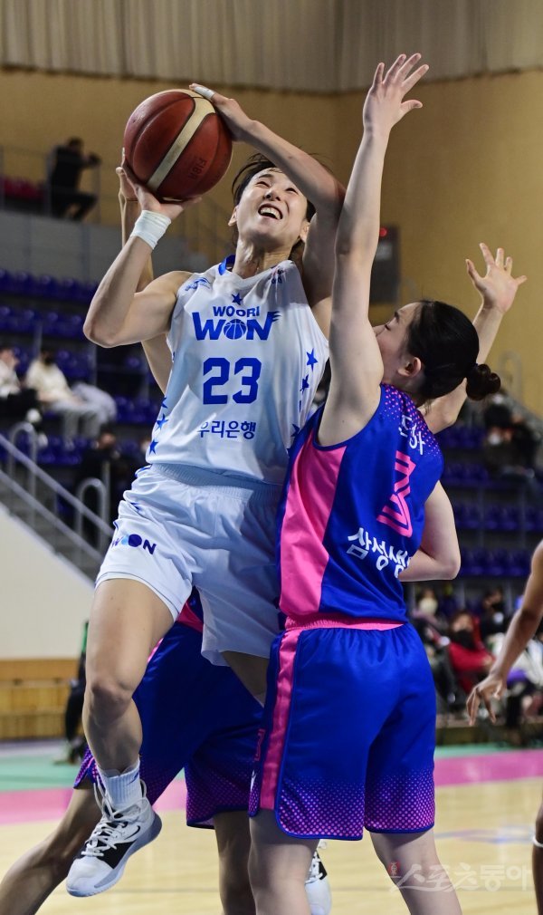 26일 경기도 용인실내체육관에서 열린 ‘신한은행 SOL 2022~2023 여자프로농구‘ 용인 삼성생명과 아산 우리은행의 경기에서 우리은행 김단비가 삼성생명 수비 앞에서 슛을 하고 있다.