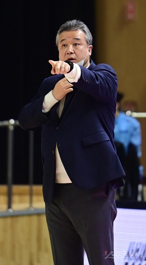 26일 경기도 용인실내체육관에서 열린 ‘신한은행 SOL 2022~2023 여자프로농구‘ 용인 삼성생명과 아산 우리은행의 경기에서 삼성생명 임근배 감독이 선수들에게 작전 지시를 하고 있다.