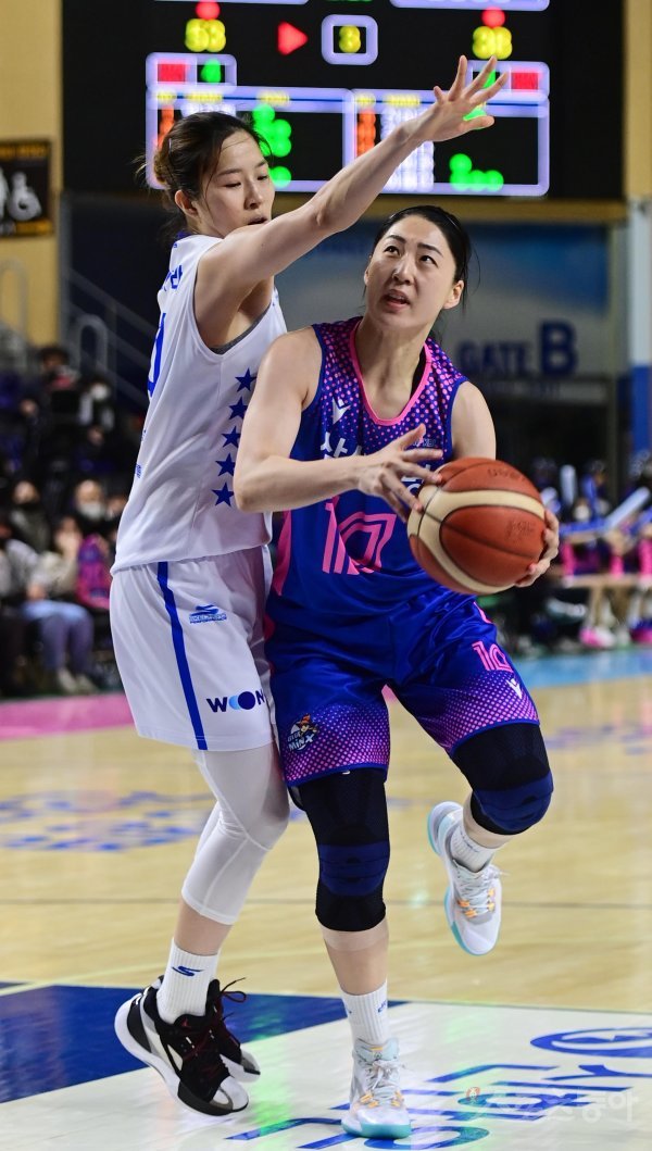 26일 경기도 용인실내체육관에서 열린 ‘신한은행 SOL 2022~2023 여자프로농구‘ 용인 삼성생명과 아산 우리은행의 경기에서 삼성생명 김한비가 우리은행 고아라 수비를 뚫고 슛을 하고 있다.