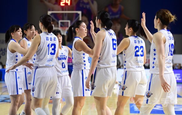 26일 경기도 용인실내체육관에서 열린 ‘신한은행 SOL 2022~2023 여자프로농구‘ 용인 삼성생명과 아산 우리은행의 경기에서 72-60으로 승리한 우리은행 선수들이 기쁨을 나누고 있다.