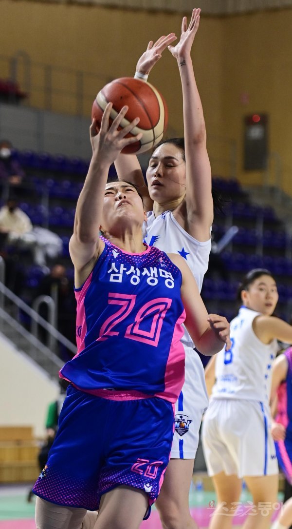 26일 경기도 용인실내체육관에서 열린 ‘신한은행 SOL 2022~2023 여자프로농구‘ 용인 삼성생명과 아산 우리은행의 경기에서 삼성생명 이명관이 우리은행 수비를 뚫고 슛을 하고 있다.