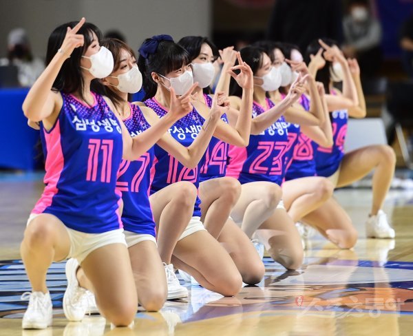 26일 경기도 용인실내체육관에서 열린 ‘신한은행 SOL 2022~2023 여자프로농구‘ 용인 삼성생명과 아산 우리은행의 경기에서 삼성생명 치어리더들이 공연을 펼치고 있다.