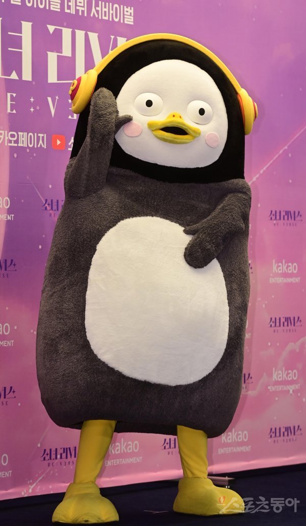 펭수가 27일 서울 마포구 상암동 스탠포드호텔에서 열린 카카오엔터테인먼트 ‘소녀 리버스’ 제작발표회에서 포즈를 취하고 있다.