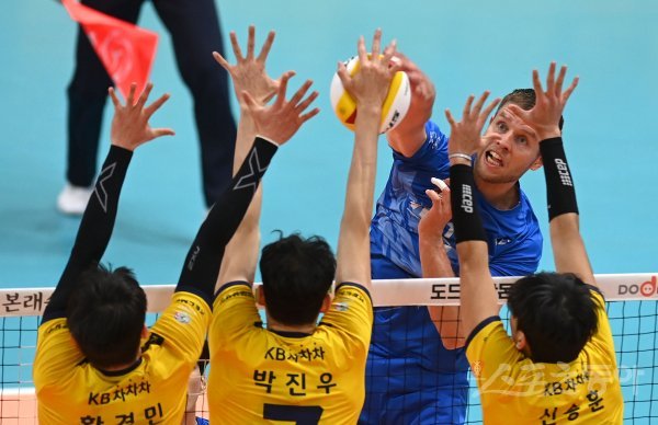 27일 의정부체육관에서 열린 ‘2022~2023 도드람 V-리그’ 남자부 KB손해보험과 한국전력 경기에서 한국전력 타이스가 KB손해보험의 블로킹 사이로 스파이크를 날리고 있다.