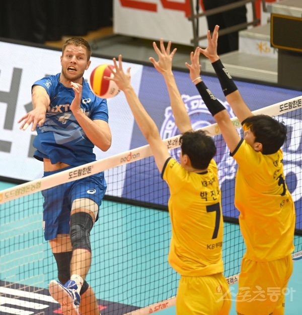 27일 의정부체육관에서 열린 ‘2022~2023 도드람 V-리그’ 남자부 KB손해보험과 한국전력 경기에서 한국전력 타이스가 KB손해보험의 블로킹 사이로 스파이크를 날리고 있다.