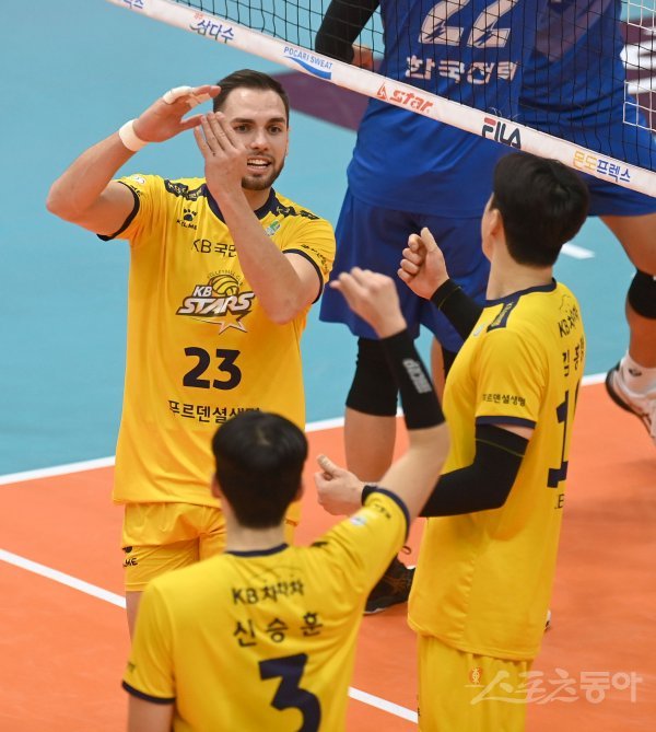 27일 의정부체육관에서 열린 ‘2022~2023 도드람 V-리그’ 남자부 KB손해보험과 한국전력 경기에서 KB손해보험 비예나가 블로커 터치에 대해 어필하고 있다.