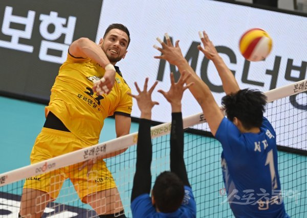 27일 의정부체육관에서 열린 ‘2022~2023 도드람 V-리그’ 남자부 KB손해보험과 한국전력 경기에서 KB손해보험 비예나가 한국전력의 블로킹 사이로 스파이크를 날리고 있다.