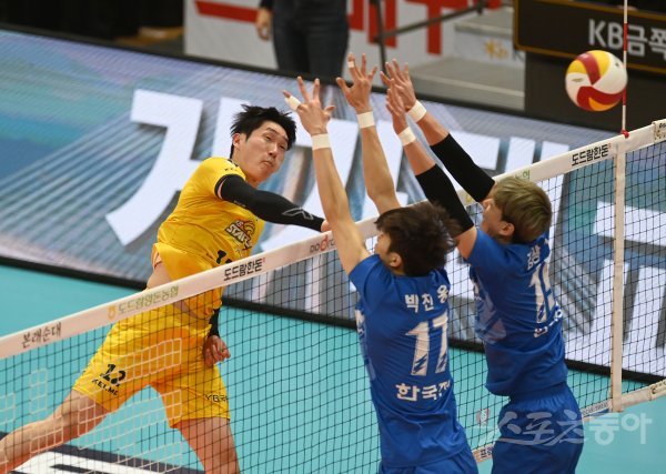 27일 의정부체육관에서 열린 ‘2022~2023 도드람 V-리그’ 남자부 KB손해보험과 한국전력 경기에서 KB손해보험 황경민이 한국전력의 블로킹 사이로 스파이크를 날리고 있다.