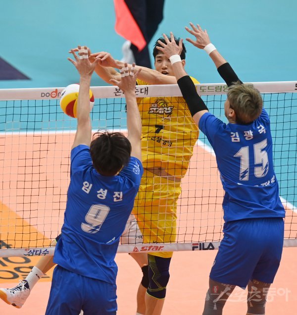 27일 의정부체육관에서 열린 ‘2022~2023 도드람 V-리그’ 남자부 KB손해보험과 한국전력 경기에서 KB손해보험 박진우가 한국전력의 블로킹 사이로 밀어넣기 공격을 하고 있다.