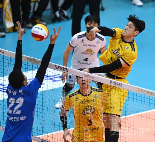 27일 의정부체육관에서 열린 ‘2022~2023 도드람 V-리그’ 남자부 KB손해보험과 한국전력 경기에서 KB손해보험 김홍정이 한국전력의 블로킹 사이로 스파이크를 날리고 있다.