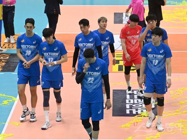 27일 의정부체육관에서 열린 ‘2022~2023 도드람 V-리그’ 남자부 KB손해보험과 한국전력 경기에서 세트스코어 1-3으로 패하며 7연패에 빠진 한국전력 선수들이 아쉬워하고 있다.