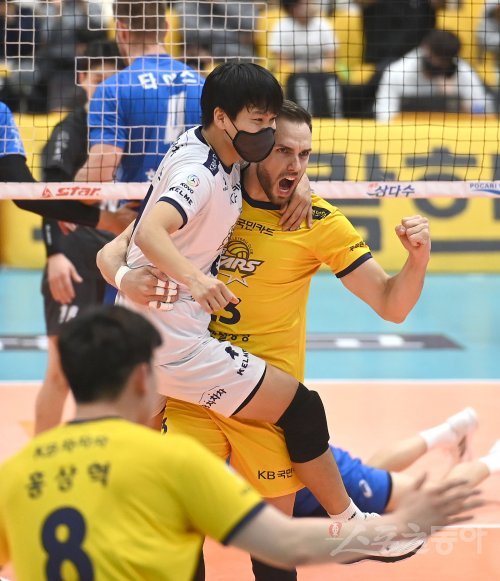 27일 의정부체육관에서 열린 ‘2022~2023 도드람 V-리그’ 남자부 KB손해보험과 한국전력 경기에서 KB손해보험이 세트스코어 3-1 승리를 거뒀다. 서브 득점으로 경기를 마친 한국민이 팀 동료들과 기뻐하고 있다. 의정부 | 김종원 기자 won@donga.com