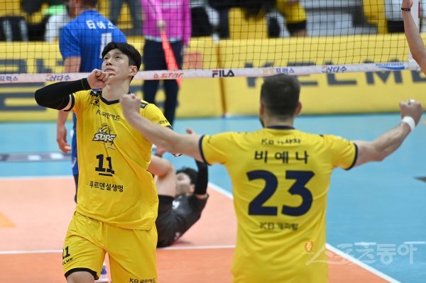 27일 의정부체육관에서 열린 ‘2022~2023 도드람 V-리그’ 남자부 KB손해보험과 한국전력 경기에서 KB손해보험 김홍정이 블로킹 득점에 성공한 후 환호하고 있다.