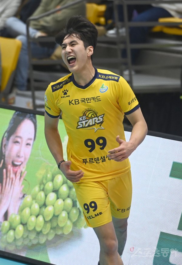 27일 의정부체육관에서 열린 ‘2022~2023 도드람 V-리그’ 남자부 KB손해보험과 한국전력 경기에서 KB손해보험 박현빈이 블로킹 득점에 성공한 후 환호하고 있다.