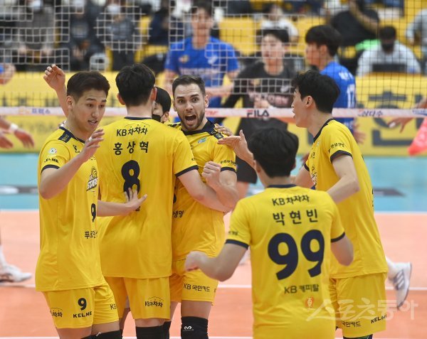 27일 의정부체육관에서 열린 ‘2022~2023 도드람 V-리그’ 남자부 KB손해보험과 한국전력 경기에서 KB손해보험 비예나가 공격 득점에 성공한 후 환호하고 있다.