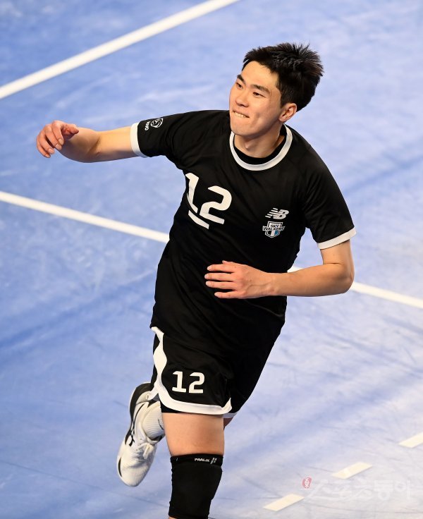 28일 천안 유관순체육관에서 열린 ‘2022~2023 도드람 V-리그’ 남자부 현대캐피탈과 OK금융그룹 경기에서 현대캐피탈 전광인이 득점에 성공한 후 기뻐하고 있다.