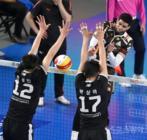 28일 천안 유관순체육관에서 열린 ‘2022~2023 도드람 V-리그’ 남자부 현대캐피탈과 OK금융그룹 경기에서 OK금융그룹 레오가 현대캐피탈의 블로킹 사이로 스파이크를 날리고 있다.