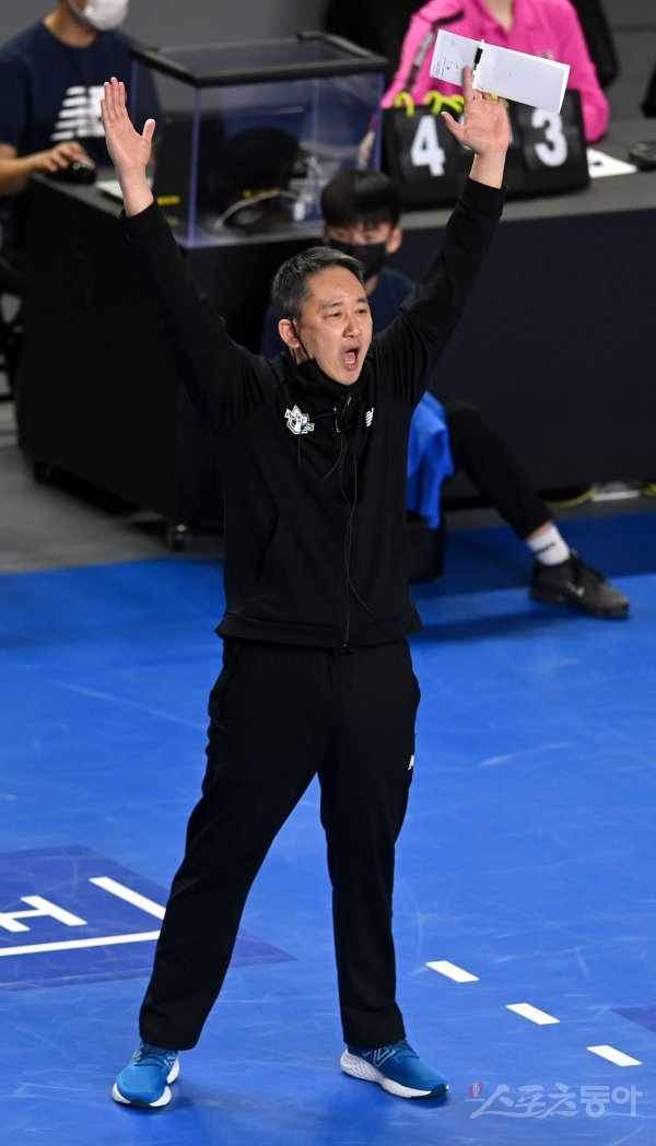 28일 천안 유관순체육관에서 열린 ‘2022~2023 도드람 V-리그’ 남자부 현대캐피탈과 OK금융그룹 경기에서 현대캐피탈 최태웅 감독이 팀 득점에 기뻐하고 있다.
