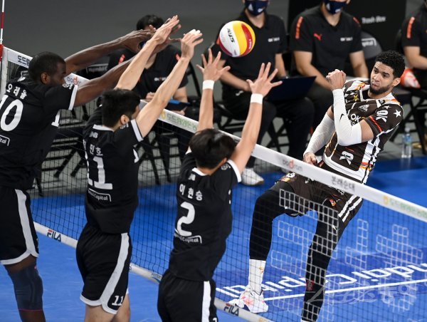 28일 천안 유관순체육관에서 열린 ‘2022~2023 도드람 V-리그’ 남자부 현대캐피탈과 OK금융그룹 경기에서 OK금융그룹 레오가 현대캐피탈의 블로킹 사이로 스파이크를 날리고 있다.