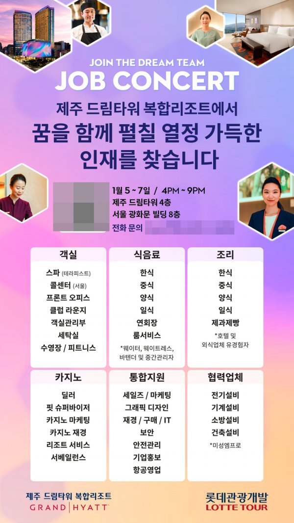 복합리조트 제주드림타워는 1월5일부터 7일까지 원스톱형 ‘잡 콘서트’를 개최한다.관심 직무 근무자와 커리어톡, 희망자 현장면접 진행