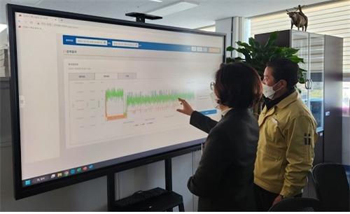 김보라(왼쪽) 안성시장이 전국 최초로 구축된 ‘양돈농가 축산냄새 관리 통합관제 시스템’을 점검하고 있다. 사진제공 | 안성시