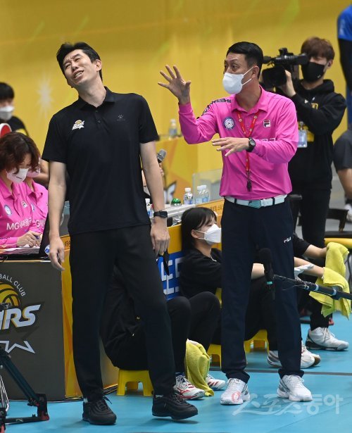 27일 KB손해보험-한국전력전, 28일 현대캐피탈-OK저축은행전에선 잇달아 판정과 비디오판독을 놓고 경기가 중단되는 소동이 빚어졌다. 판정에 대한 불신도 커지고 있다. 결국 ‘오심’으로 확인된 27일 경기 4세트 도중 판정에 항의하는 KB손해보험 후인정 감독(왼쪽). 의정부 | 김종원 기자 won@donga.com