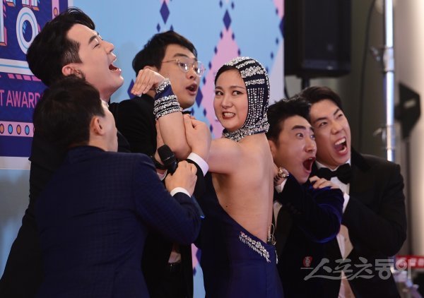 붐, 박영진, 박나래, 장동민, 양세찬이 29일 서울 마포구 상암동 MBC미디어센터에서 열린 ‘2022 MBC 방송연예대상’ 포토월에서 포즈를 취하고 있다.