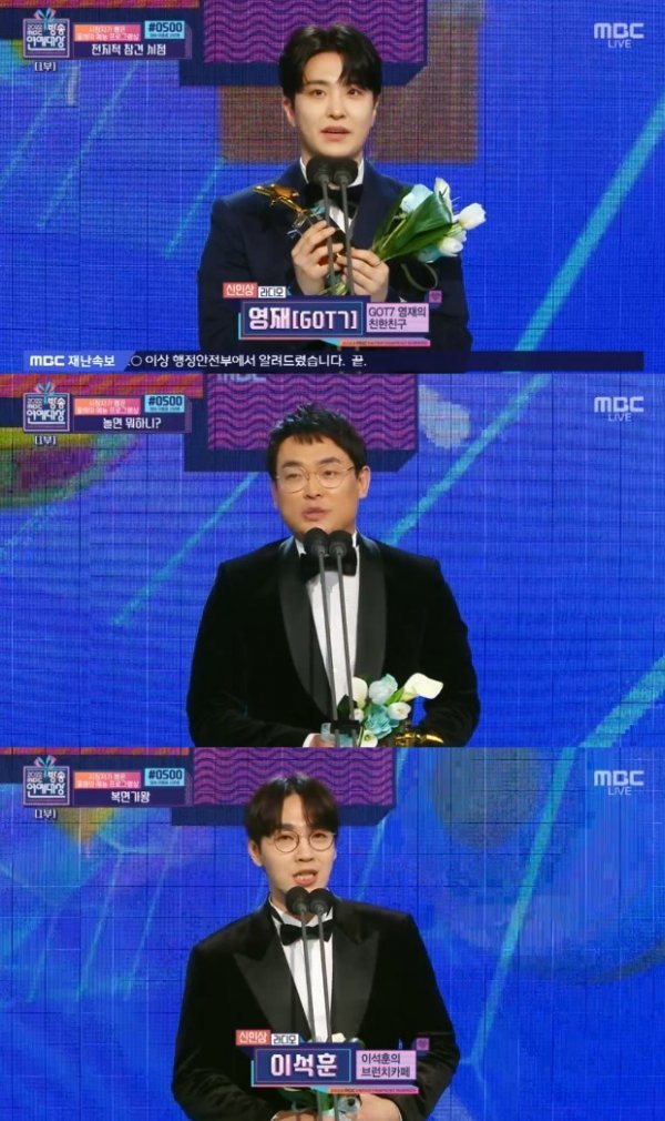 29일 ‘2022 MBC 방송연예대상’ 신인상 라디오 부문에선 '2시 만세' 박영진, '브런치 카페' 이석훈, '친한친구' 갓세븐 영재가 상을 받았다.