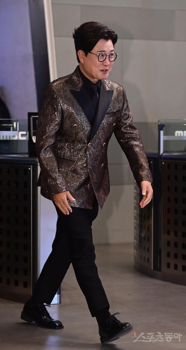 방송인 김성주가 30일 서울 마포구 상암동 MBC미디어센터에서 열린 ‘2022 MBC 연기대상’ 포토월에 입장하고 있다.