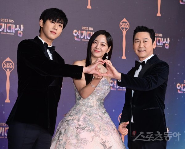 배우 안효섭, 김세정, 방송인 신동엽이 31일 서울 마포구 상암동 SBS프리즘타워에서 열린 ‘2022 SBS 연기대상’ 포토월에서 포즈를 취하고 있다.