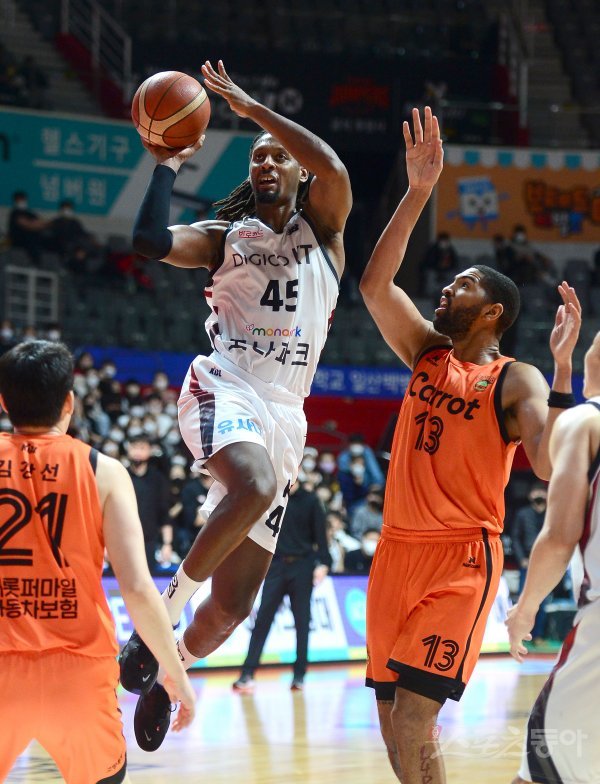1일 고양체육관에서 열린 ‘2022-2023 프로농구’ 고양 캐롯과 수원 KT 경기에서 KT 존스가 캐롯의 수비를 뚫고 골밑 슛을 하고 있다.