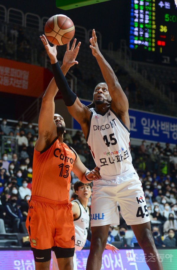 1일 고양체육관에서 열린 ‘2022-2023 프로농구’ 고양 캐롯과 수원 KT 경기에서 KT 존스가 리바운드 볼을 잡고 있다.