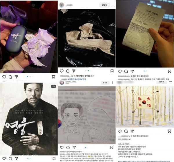 한국영화 박스오피스 정상을 굳건히 지키고 있는 ‘영웅’을 향한 실관람객들의 다채로운 호평이 이어지고 있다. 자긍심을 불러일으키는 스토리와 배우들의 뜨거운 열연이 관객들의 마음을 움직이며 잊지 못할 여운을 전하고 있는 것. 관람 중 흘린 눈물을 닦은 휴지를 찍어 올리는 ‘폭풍 오열’ 인증 유형부터 안중근 의사와 독립군들의 숭고한 희생에 존경심을 그림으로 표현한 ‘팬아트’ 유형, 잊지 못할 역사를 기억해야 한다는 ‘역사 공부’ 유형 등 다채로운 리뷰로 온라인을 달구고 있다.