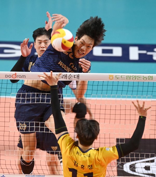 3일 서울 장충체육관에서 열린 ‘2022~2023 도드람 V-리그’ 남자부 우리카드와 KB손해보험 경기에서 우리카드 이상현이 KB손해보험의 블로킹 사이로 스파이크를 날리고 있다.
