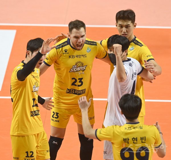 3일 서울 장충체육관에서 열린 ‘2022~2023 도드람 V-리그’ 남자부 우리카드와 KB손해보험 경기에서 KB손해보험 비예나가 득점에 성공한 후 기뻐하고 있다.