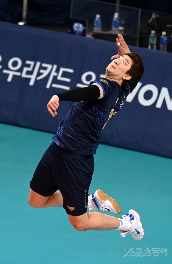 3일 서울 장충체육관에서 열린 ‘2022~2023 도드람 V-리그’ 남자부 우리카드와 KB손해보험 경기에서 우리카드 나경복이 서브 득점을 성공시키고 있다.
