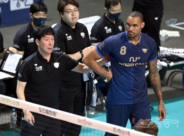 3일 서울 장충체육관에서 열린 ‘2022~2023 도드람 V-리그’ 남자부 우리카드와 KB손해보험 경기에서 우리카드 아가메즈가 신영철 감독의 격려를 받고 있다.