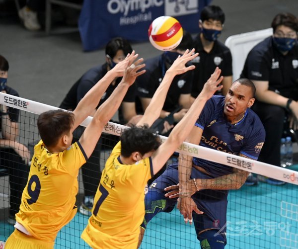 3일 서울 장충체육관에서 열린 ‘2022~2023 도드람 V-리그’ 남자부 우리카드와 KB손해보험 경기에서 우리카드 아가메즈가 KB손해보험의 블로킹 사이로 스파이크를 날리고 있다.