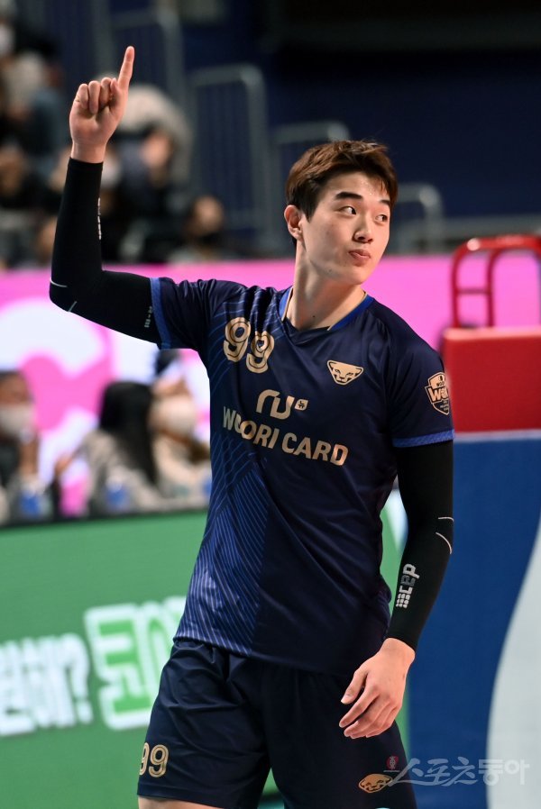 3일 서울 장충체육관에서 열린 ‘2022~2023 도드람 V-리그’ 남자부 우리카드와 KB손해보험 경기에서 우리카드 김지한이 블로킹 득점에 성공한 후 기뻐하고 있다.