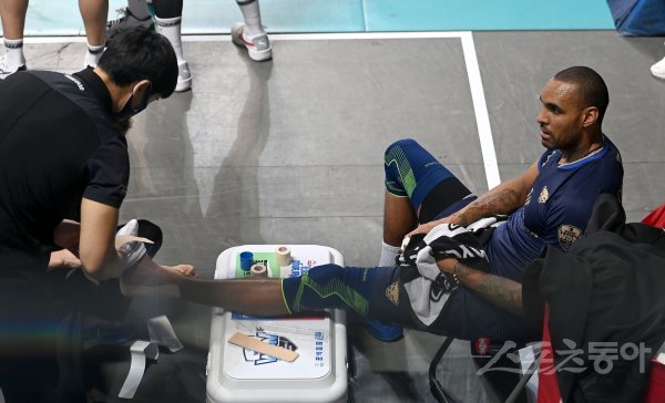 3일 서울 장충체육관에서 열린 ‘2022~2023 도드람 V-리그’ 남자부 우리카드와 KB손해보험 경기에서 우리카드 아가메즈가 부상 위험으로 잠시 벤치에서 쉬고 있다.