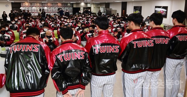 LG 트윈스가 4일 서울 잠실야구장에서 ‘2023년 선수단 신년하례식’을 열렸다. LG 신인 선수들의 인사에 염경엽 감독을 비롯한 선수단이 손뼉을 치고 있다.
