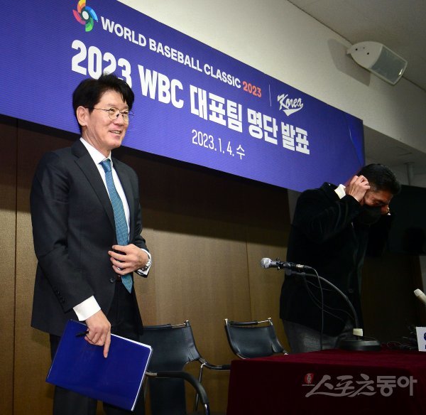 한국야구위원회(KBO)는 4일 서울 강남구 도곡동 야구회관에서 월드베이스볼클래식(WBC)에 출전할 명단 발표 기자회견을 가졌다. 이강철 국가대표팀 감독과 조범현 대표팀 기술위원장이 기자회견을 마치고 회견장을 나서고 있다.