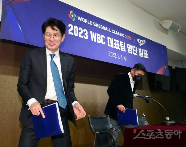 한국야구위원회(KBO)는 4일 서울 강남구 도곡동 야구회관에서 월드베이스볼클래식(WBC)에 출전할 명단 발표 기자회견을 가졌다. 이강철 국가대표팀 감독과 조범현 대표팀 기술위원장이 기자회견을 마치고 회견장을 나서고 있다.