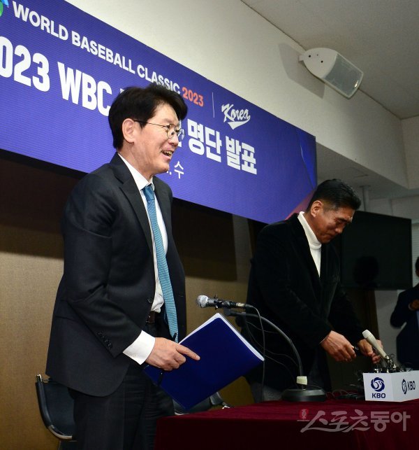 한국야구위원회(KBO)는 4일 서울 강남구 도곡동 야구회관에서 월드베이스볼클래식(WBC)에 출전할 명단 발표 기자회견을 가졌다. 이강철 국가대표팀 감독과 조범현 대표팀 기술위원장이 기자회견을 마치고 회견장을 나서고 있다.